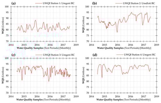 Umgeni Water Board (UWB) provided the water quality dataset used to test the UWQI. The data are from six sampling stations located in four different catchments under the jurisdiction of Pongola-Mtamvuna Water Management Area (WMA) in KwaZulu-Natal Province, South Africa. The four watershed regions are Umgeni, Umdloti, Nungwane and Umzinto/uMuziwezinto River catchments. The UWQI is earmarked for national application, but it is far-reaching and beyond the scope of the study to test the model against data from all 148 catchment regions in South Africa. Nevertheless, the four catchments used are adequate to ascertain the functionality of the model and the process is a step towards the ultimate goal of testing the model against most, if not all, the catchment areas in South Africa. The model responded steadily to the variation in parameter values and managed to indicate spatial and temporal changes in water quality for the four catchment areas considered for the study. It should be noted that the UWQI is formed autonomously without being linked to a particular dataset or specific region. The methods used are exclusively independent from such associations and the UWB dataset is entirely for testing purposes, upon which tasks can be performed using any other available data.