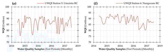Water quality index results calculated using the developed universal water quality index (UWQI) for Umgeni water quality data for a period of four years from June 2014 to July 2018 (a) Umgeni River catchment for Henley Dams, (b) Umdloti River catchment for Hazelmere Dam, (c) Umgeni River catchment for Inanda Dams, (d) Umgeni River catchment for Midmar Dam, (e) Umzinto/uMuziwezinto River catchment for Umzinto Dam, and (f) Nungwane River catchment for Nungwane Dam.