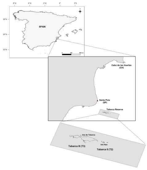 Map of the Alicante region of the Spanish coast, including sampling sites (dots) at Cabo de las Huertas (CH), Santa Pola (SP), and the Tabarca marine reserve (Isla Nao—T2 and Isla de Tabarca—T3.