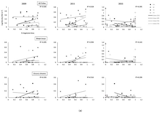 (a) Relationships (Global R2) between the percentage of vegetated area surveyed and annual average density for all fishes and the five most abundant species per survey site (Cabo de las Huertas—CH; Santa Pola—SP; Tabarca II—T2; Tabarca III—T3). Global R2 values depict overall global fit for each ANCOVA model. (b). Relationships (Global R2) between the percentage of vegetated area surveyed and annual average density for all fishes and the five most abundant species per survey site (Cabo de las Huertas—CH; Santa Pola—SP; Tabarca II—T2; Tabarca III—T3). Global R2 values depict overall global fit for each ANCOVA model.