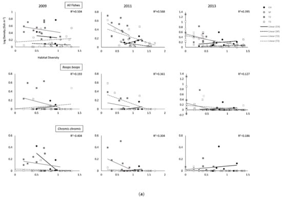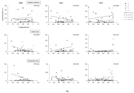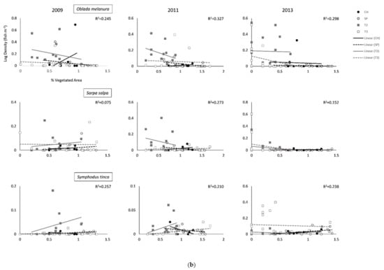 In 2011, densities for Boops boops (Bogue) were significantly lower at SP than at all other sites when accounting for percent cover (p = 0.019), with significant effects of habitat diversity observed during 2011 (p = 0.004) and 2013 (p = 0.025; Table 2 and Table 3; Figure 2a and Figure 3a, Figures S1 and S2). For all years, B. boops densities were generally highest in Posidonia and rock habitats in T2 and T3 (Table S1). In 2011 and 2013, Oblada melanura (Saddled Seabream) densities in T2 were significantly higher than all other sites when accounting for percent cover, with significant effects of habitat diversity similarly observed during these years. O. melanura densities were generally highest in T2 and T3 Posidonia habitats (Table S1). Neutral to negative relationships between habitat diversity and B. boops and O. melanura densities were additionally observed (Figure 3a,b). Densities for Symphodus tinca (East Atlantic Peacock Wrasse) in 2013 were significantly highest in T3 among all sites when accounting for either percent cover (p = 0.003) or habitat diversity (p = 0.004; Table 3; Figures S1 and S2). Densities were generally highest in T2 and T3 Posidonia and rock habitats (Table S1). An additional significant and overall positive effect of percent vegetated cover (p = 0.001) was observed for 2009 S. tinca densities (Table 2; Figure 2b). Although no significant differences across sites were observed for Sarpa salpa (Salema Porgy) densities, significant effects of percent vegetated cover (2009, p = 0.014) and habitat diversity (2011, p = 0.027; 2013, p = 0.014) were found. Densities were generally highest in T2 and T3 Posidonia habitats (Table S1). Overall significant negative relationships between habitat diversity and S. salpa densities were observed, in addition to a negative relationship between S. salpa density and vegetated cover during 2009 (Figure 2b).