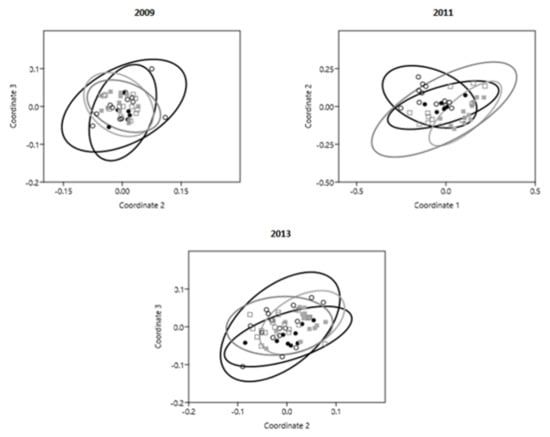 Non-metric multidimensional scaling (nMDS) ordinations with 95% confidence ellipses per site (Cabo de las Huertas—CH, black solid circles; Santa Pola—SP, black open circles; Tabarca II—T2, gray solid squares; Tabarca III—T3, gray open squares).