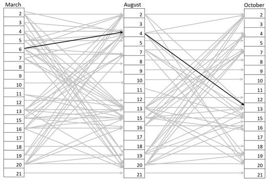 All seasonal land-use maps were integrated in GIS, in a raster format, and land-use-trajectory change in Usa catchment was analyzed pixel by pixel, using the overlay analysis, as applied in [32]. Trajectories from the three land-use maps (March, August, and October) of Usa catchment were generated with the corresponding land-use codes described in Table 1 and Figure 2. For example, as highlighted in Figure 2, a trajectory can be identified as 6 → 4→ 13, which means land-use changes from rainfed maize to bare land to irrigated mixed crops in March, August, and October maps, respectively. A total of 1160 trajectories were generated. However, some trajectories were unrealistic, such as a change from irrigated mixed crops land use in March to dense forest land use in August and to rainfed maize land use in October. These unrealistic trajectories, as well as the trajectories that took a small percentage of the overall trajectories, were excluded. Of the 1160 trajectories, the top 130 trajectories, covering about 90% of the whole catchment, were considered.
