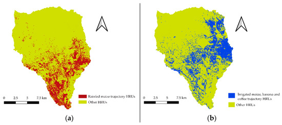 (a) HRUs for implementation of rainfed maize to irrigated mixed crops to irrigated mixed crops trajectory and (b) HRUs for the implementation of irrigated banana, coffee, and maize to irrigated banana and coffee to irrigated banana, coffee, and maize trajectory.