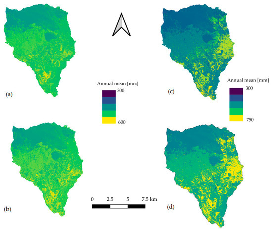 (a) ET at HRU level in default SWAT model; (b) ET at HRU level in default SWAT+ model; (c) ET at HRU level after implementation of trajectories in the SWAT model; (d) ET at HRU level after implementation of trajectories in SWAT+ model.