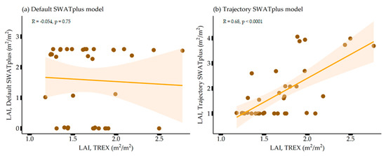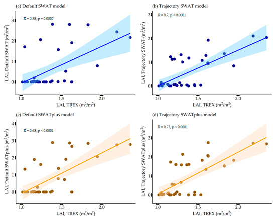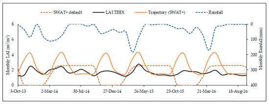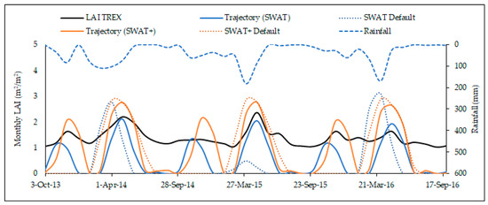 Both trajectory implementations in SWAT and SWAT+ models capture the two major growing seasons within the two rainy seasons, as the LAI increases between the seasons, following the TREX LAI pattern in Figure 5. The correlation between the trajectory LAI and TREX LAI slightly increased in Figure 6b,d for both model implementations, signifying an improved relationship. The slight increase in correlation can be attributed to the implementation of the seasonal land-use trajectories in the model, giving LAI patterns that captures the two growing seasons corresponding to the TREX LAI vegetative growth patterns. However, the LAI of the trajectory simulations dropped to zero in February and September, which are dry months in the catchment [7], unlike the TREX LAI that does not drop to zero. This reflects the inclusion of other vegetation within the TREX LAI pixel that are averaged together rather than representing a single crop as simulated by the SWAT and SWAT+ models. This shows the complexity and scaling issues when using remote-sensing products in model evaluation at the HRU level.