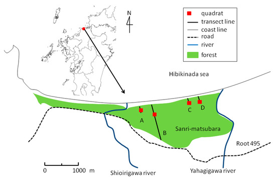 The Sanri-Matsubara Forest is one of the largest coastal P. thunbergii forests in the northern part of Kyushu Island in southwestern Japan (Figure 1). The forested area is 12 km along the coastline, and its maximum width is 1.3 km. The total area of the forest is approximately 4.3 km2. The north of the Sanri-Matsubara Forest faces the Hibikinada Sea. The main forest types of the Sanri-Matsubara Forest are P. thunbergii stands and evergreen broadleaf forest stands consisting of Ligustrum japonicum Thunb., Cinnamomum japonicum Sieb. ex Nakai, Cinnamomum camphora (L.) J. Presl, and Celtis sinensis Pers. var. japonica (Planch.) Nakai. The soil is the sand dune regosol type.