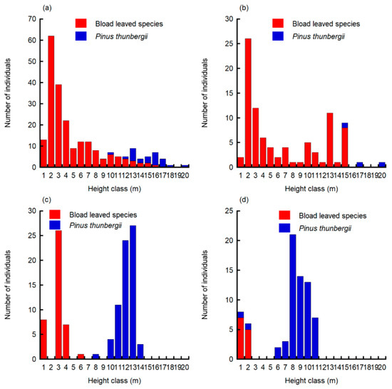 P. thunbergii dominated the canopy of quadrat A, evergreen broadleaf tree species dominated the sub-canopy and the understory, and some broadleaf species together with P. thunbergii comprised the mixed canopy (Figure 2a). Evergreen broadleaf trees dominated the canopy and the understory of quadrat B, and some P. thunbergii were mixed with broadleaf species in the canopy (Figure 2b). P. thunbergii dominated the canopy in quadrat C, and evergreen broadleaf trees dominated the understory (<5 m in height; Figure 2c). P. thunbergii dominated the canopy of quadrat D, and some juveniles of P. thunbergii and broadleaf species were in the understory (Figure 2d). The forest type of each quadrat was categorized as A: mixed forest of Pinus and evergreen broadleaf species (mixed stand), B: evergreen broadleaf forest (broadleaf stand), C: Pinus forest with broadleaf trees in the understory (Pinus dominated stand), and D: almost pure Pinus forest (pure Pinus stand).