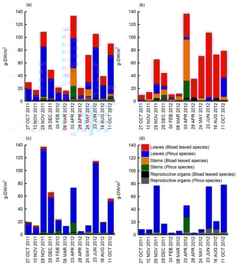 Dry weight of litter collected with five 0.5 m × 0.5 m litter traps established in each quadrat, (a) quadrat A (mixed stand), (b) quadrat B (broadleaf stand), (c) quadrat C (Pinus dominated stand), and (d) quadrat D (pure Pinus stand) in the Sanri-Matsubara Forest, south-western Japan, Litter traps were established on 19 October 2011 and collected litters until 1 November 2012. The date shows the middle day of each sampling period.
