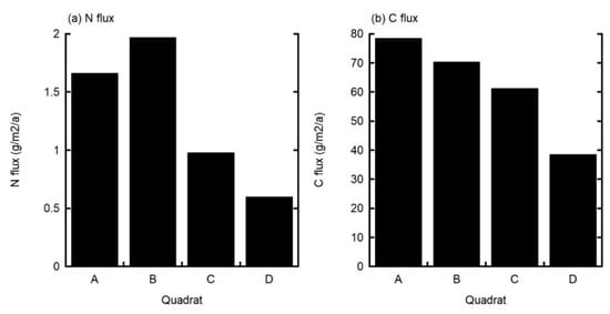 Carbon content in the litter fall was ca. 51% (w/w) for the P. thunbergii litter and ca. 48% for the evergreen broadleaf species irrespective of the plant organs, and the differences between species were not significant (Table 1). The nitrogen content of broadleaf species leaves was higher than that of the litter of P. thunbergii leaves, and the nitrogen content in the leaves of broadleaf species (ca. 1.6%) was approximately twice that of the P. thunbergii litter (ca. 0.7%). The C/N ratio of the litter of P. thunbergii leaves was significantly higher than that of broadleaf tree leaves. Annual N flux on the soil surface by litter deposition was highest in the broadleaf stand (quadrat B), and decreased in the order of mixed stand (quadrat A), Pinus dominated stand (quadrat C), and pure Pinus stand (quadrat D) (Figure 4). The annual cumulative carbon deposited on the soil surface in the mixed stand was the highest (ca. twice that of the pure Pinus stand), and decreased based on the following order: broadleaf stand, Pinus-dominated stand, and pure Pinus stand.