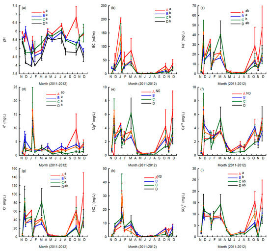 Throughfall pH showed a relatively lower value (ca. 4.0–5.0) from December to March, whereas pH showed a relatively higher value (ca. 5.5–6.5) from April to July (Figure 5a). Throughfall pH in quadrat D was significantly lower than those in the other three quadrats. EC and ionic concentration of the throughfall, except for K+, showed a relatively lower value from April to August compared with the other seasons (Figure 5b–i). K+ of throughfall remained at <4 mg/L throughout the investigation period, with the exception of some higher values observed in November, January, and October (Figure 5d). EC in quadrat A was significantly higher than those of the other three quadrats (Figure 5b).