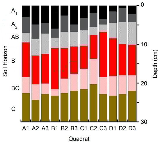 The thickness of the A horizon in the soil profiles of the quadrats differed between forest types (Figure 6). Thickness of A horizon (A1 and A2) in the Pinus stand (quadrat D) was <5.0 cm, 5.0–7.0 cm in quadrat C (Pinus dominated stand), and 6.0–7.0 cm in quadrats A (mixed stand) and B (broadleaf stand). B horizon thickness showed little differences between quadrats.