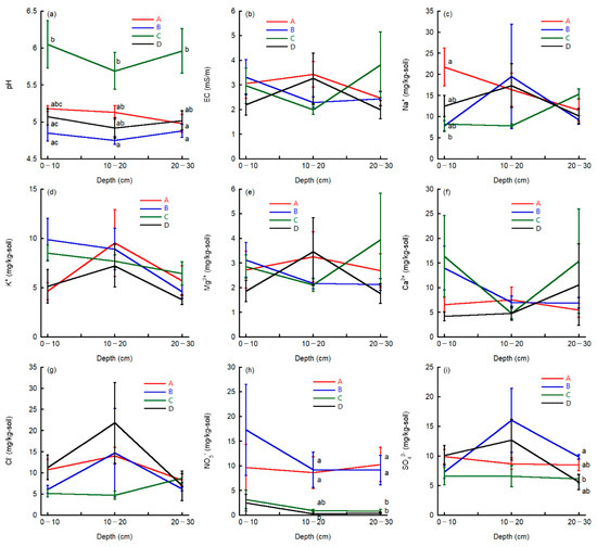 Chemistry of soil extracted water of samples in 0–10 cm, 10–20 cm, and 20–30 cm depths in each quadrat of the Sanri–Matsubara Forest, south–western Japan. (a) pH, (b) EC, (c) Na+, (d) K+, (e) Mg2+, (f) Ca2+, (g) Cl−, (h) NO3−, and (i) SO42−. Vertical bars denote SE. Significance of difference between quadrats was tested by Kruskal-Wallis test and the following Mann–Whitney U-test with Bonferroni correction. Means sharing the same letter (a, b, c) were not significantly different (p < 0.05) among each soil depth. Values without letters are not significantly different.