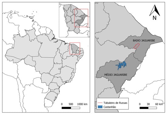 Located in the river basin of Baixo Jaguaribe (Figure 1), the climate of the region is hot and semi-arid and characterized as dry and very hot as per the Köppen classification. The mean annual precipitation of 720 mm is irregularly distributed throughout the year, mostly between the months of December and June or July, with the highest precipitation rates between February and April. The mean relative air humidity and the mean monthly temperature are 60% and 27 °C, respectively, while the evaporative demand is 2900 mm year−1 [33].