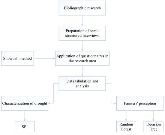 Methodological flowchart describing the steps taken in this study. Bibliographic research was followed by questionnaire preparation, application of questionnaires via the snowball method, and data tabulation and analysis. Two types of data tabulation and analysis were used: characterization of drought using SPI and the selection of explanatory variables for farmers’ perception using RF and DT techniques.
