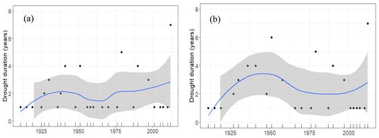Drought duration (years) in the time series of 1911–2018: (a) for Baixo Jaguaribe; and (b) for Médio Jaguaribe. The duration was calculated based on the SPI12 time series. Each rug on the x-axis indicates the occurrence of one drought. Smoothed linear regression of drought duration is presented in blue. The gray area indicates the 95% confidence interval.