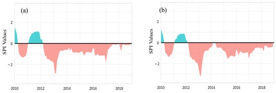The SPI classification with respect to drought severity is displayed in Table 1, according McKee et al. [40]. SPI classification values were obtained for each month. For this classification, the onset of a drought was identified by means of a retroactive procedure. As such, an event was classified as a drought by identifying a series of continuously negative values (i.e., when the SPI takes the value of −1 or less). The duration corresponds to the number of years that elapsed between the beginning and the end of the event.