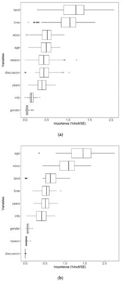 With respect to drought duration (Figure 7a), the RF method indicated that the number of actively cultivated land plots belonging to the farmer (land) and the years of work experience of the farmer in the agriculture sector (time) were the most important explanatory variables for drought perception. Other significant explanatory variables were: the respondent’s opinion regarding the reason for drought (reason), age of the respondent (age), and the respondent’s level of education (educ).