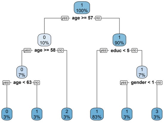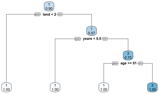 With respect to drought duration (Figure 8), each independent variable was accompanied by its respective decision threshold value. The construction of the DT involved selecting the variable that maximized the quality of the dataset and minimized its entropy. In this case, the first node or root node was represented by the number of cultivated land plots, with a lower threshold of two actively cultivated plots being stipulated for the next subdivision. If this condition was not met, the second node corresponded to years of agricultural experience, for which the threshold limit was set to less than 5.5 experienced drought years. If the second node was negative, the model considered a third node, using the variable age and a threshold greater than or equal to 51 years. The percentage of observations for the respective response appears below each result in Figure 8.