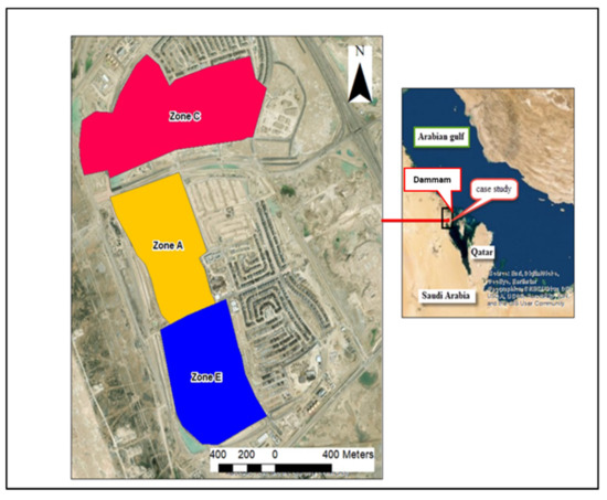 Saudi Arabia is constructing new urban communities to relieve pressure on major cities, improve living conditions for citizens and improve infrastructure. The study area is located near Dammam in the Kingdom of Saudi Arabia (KSA), which is located 17 km from the Arabian Gulf and 7 km from Dammam city. Figure 1 shows the location map of the study area. It is divided into a number of zones. In this study, three zones are considered, A, C and E, as shown in Figure 1. Three zones are selected due to the variation in KSA’s official master plan, outlets and urbanization ratio to study the effect of urban growth and return period design on different parameters such as outlet discharge, velocity in storm drainage pipes and the time of arrival of water from the furthest point in the region to the outlet (time of concentration), as well as the cost of construction for the storm water drainage network.