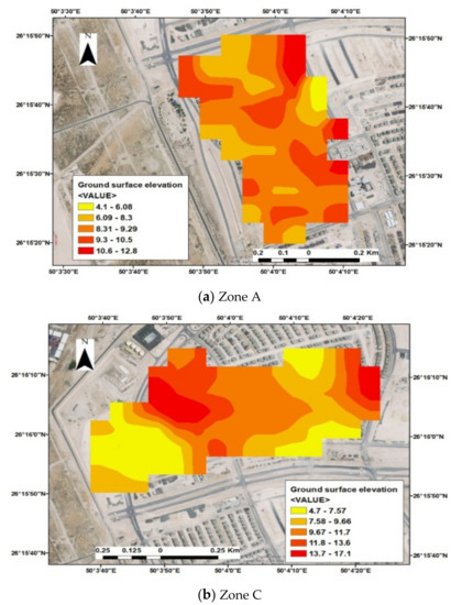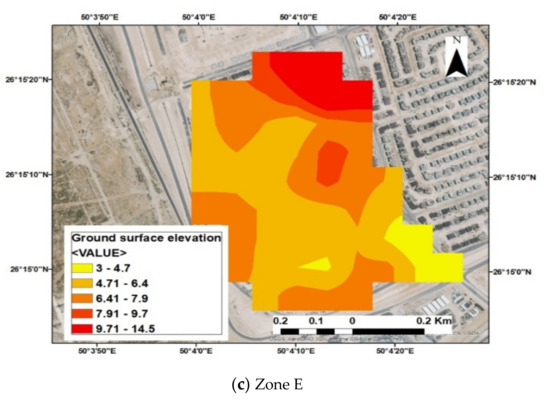 Three zones were considered in this study, A, C and E, which have different characteristics. The first zone (A) is located at 26°15′35.10″ N, 50°4′0.32″ E, the second zone (C) is located at 26°16′5.02″ N, 50°4′10.12″ E, and the third zone (E) is located at 26°15′4.43″ N, 50°4′9.37″ E. The area of the first zone (A) is equal to 0.4 km2. This zone is located in the central part of the study area. It is bordered by zone (C) from the north and zone (E) from the south, as shown in Figure 1. The ground surface elevation of this zone ranges from 4.1 to 12.8 m, as shown in Figure 2a. The ground slope extended from east to west and from east to south. According to these conditions, the layout of the storm water drainage network of this zone is lined up with these coordinates, as shown in Figure 3a. There are seven existing disposal points that drain their water to a concrete culvert with dimensions of 2.00 × 1.00 m around the study area, so all pipes are distributed to these points; the total length of the storm pipes is 3 km.