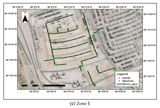 The second zone (C)’s area is equal to 0.7 km2. This zone is located in the north of the study area, as is shown in Figure 1. The elevation of this zone ranges from 4.3 to 17.2 m above mean sea level, as shown in Figure 2b. The ground slope extended from east to west and from east to south; according to this condition, the layout of the storm water drainage network of this zone is lined up with these directions as shown in Figure 3b. There are 14 exit disposal points so all pipes area distributed to these points and the total length of storm pipes is 4 km. The third zone (E) area is equal to 0.5 km2. This zone is located at the south of the studied areas as shown in Figure 1. The elevation of this zone ranged from 3 to 14.50 m as is shown in Figure 2c. The ground slope extended from north to south; according to these conditions, the layout of the storm water drainage network of this zone is lined up with these coordinates, as shown in Figure 3c. There are five exit disposal points, so all pipes are distributed to these points; the total length of the storm pipes is 3.50 km.