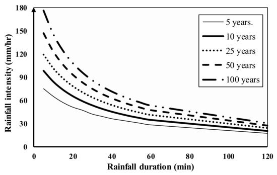 The daily rainfall data for 30 years from Dammam rain gauge station were collected to estimate runoff. The total rainfall values received in the given period at the Dammam station are highly variable from one year to another. This variability depends on the climate conditions and the length of the considered period. It can be stated that Dammam has a dry climate and shows a high variability in rainfall over time. Quality control programs were used for spatial and time series rainfall data from Dammam and relationships between elements. In addition to these programs, standard deviations and variation coefficients were calculated and compared with other model results such as Hyfran (Hydrological Frequency Analysis) software, which is used to fit statistical distributions through mathematical tools for the statistical analysis of extreme events. Bell’s equation (1969) [36] was used to calculate the short duration rainfall intensity from daily rainfall intensity. The results are shown in Figure 4; the maximum rainfall intensity at different return periods could be estimated for use in predicting the flood frequency analysis of Dammam station. Figure 4 shows the Intensity Duration Frequency Curve (IDF) of the Dammam rainfall station [36].