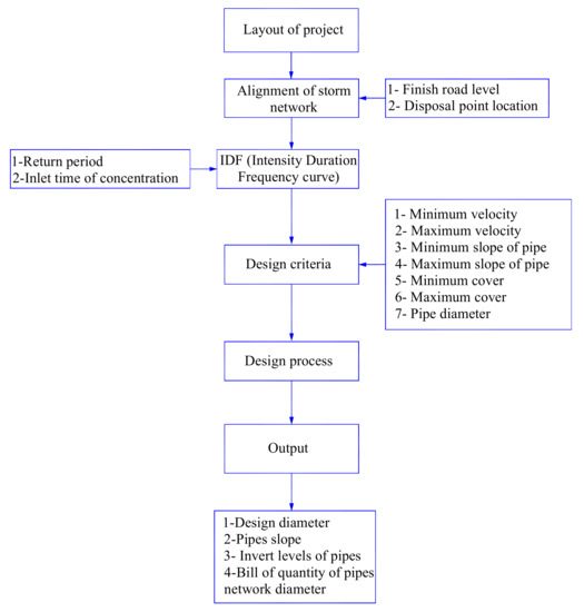 The methodology of the current study includes data collection and the use of hydrological models for the simulation of runoff. The collected data include hydrological data, topographic maps, digital elevation models, land use, Google Earth satellite images and Landsat images. The Hyfran model is used for rainfall data statistical analysis, StormCAD is used for the design of the storm water drainage system for different return periods and different runoff coefficients. These are used to analyze the storm sewer system from the gutter to the outlet. StormCAD estimates the actual overflow of catchment, stub out, manholes, pipe diameters, and outlets [33]. The inputs of the program include ground level, manhole spacing, rainfall intensity and runoff coefficient. The design procedure is controlled by constraints such as pipe diameters and materials, minimum and maximum velocity, covers, slopes and pipe connections. The outputs of the program are the pipe diameters, pipe invert levels, depth of flow and velocity. GIS is used to present the results.