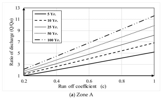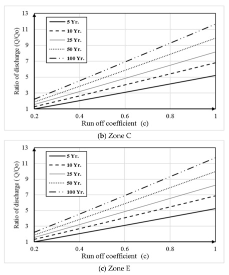 In this scenario, the effect of changing the runoff coefficient (C) due to urban growth on the outlet discharge (Q) is calculated for different return periods. The relationship between the runoff coefficient (C) and the ratio of the outlet discharge to the outlet discharge of the base case (Q/Q0) is calculated and presented in Figure 6a–c for the three zones, A, C and E, respectively. The results show that increasing the runoff coefficient increased the outfall discharge for the different return periods.