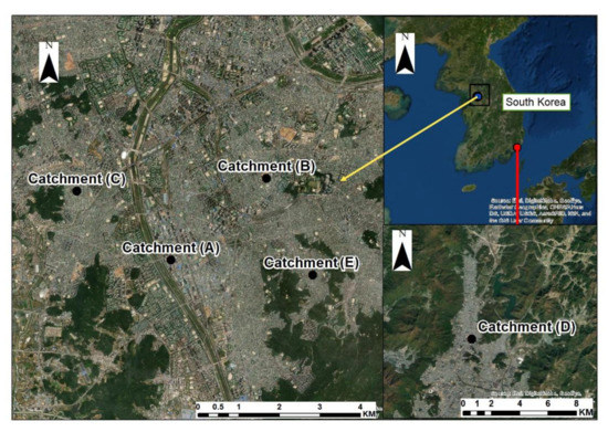 For the validation of the developed equation, a case study is selected from South Korea. Five urban catchments in Seoul and Busan, South Korea, were selected, as shown in Figure 7. The physical data and maximum discharges of these zones are listed in Table 4. Descriptions of these zones are as follows: