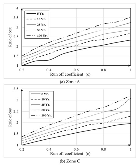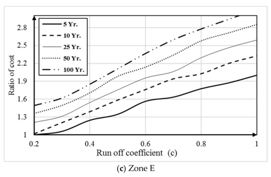 The egression method was used to create an equation for the cost ratio based on the runoff coefficient and return period (Equation (5)). The confidence interval was equal to 94%. This equation was based on the available data for the three zones and can be applied to determine the cost ratio as follows:
