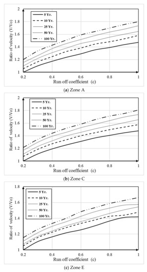 This scenario presents the effect of changing the runoff coefficient (C) on the average velocity in the storm water drainage system. Increasing the runoff coefficient (C) increased the outfall discharge (Q), which increased the velocity in the system. StormCAD was used to assess the new runoff coefficients. The new outfall discharges and average velocities are calculated according to Manning’s equation. The relationship between the runoff coefficient (C) and the ratio of average velocity to the average velocity of the base case was calculated and is presented in Figure 10a–c for the three zones, A, C and E, respectively. The velocity (V) was calculated by StormCAD using Manning’s equation based on pipe slope and diameter. The velocity of flow at a return period of 5 years and a runoff coefficient equal to 0.20 is considered (Vo). The results show that increasing the runoff coefficient increased the average velocity and pipe diameter for the different return periods. The increase in velocity at the 100-year return period was between 1.5 and 1.8 times that of the base case, as shown in Figure 10.