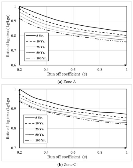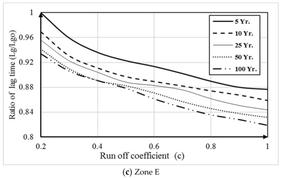 This scenario is carried out to show the effect of changing the runoff coefficient (C) on the lag time for different return periods. Changes in urbanization have changed the runoff coefficient, which resulted in a change in the lag time. The relationship between the runoff coefficient (C) and the ratio of current lag time to the base case lag time was calculated and presented in Figure 11a–c for zones A, C and E, respectively. Increasing the runoff coefficient for different return periods decreased the lag time, which is important in a warning system. Increasing the runoff coefficient from 0.20 to 0.60 for return periods 5, 10, 25, 50 and 100 decreased the lag time by 0.85, 0.86, 0.87, 0.89 and 0.91 times that of the base case, respectively, as shown in Figure 9. The decrease in lag time at the 100-year return period was between 0.8 and 0.9 times that of the base case, as shown in Figure 11.