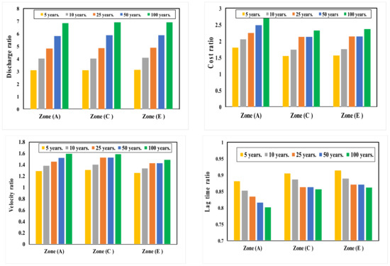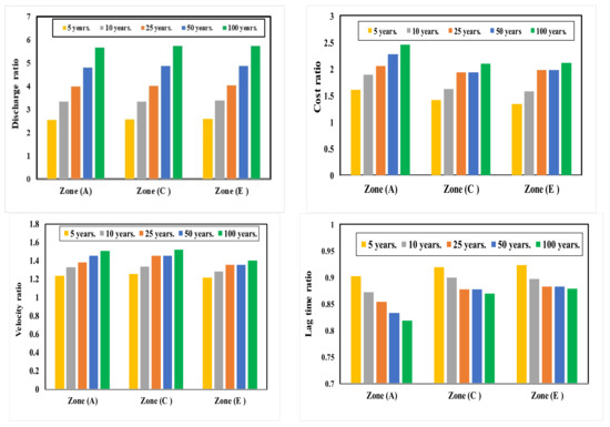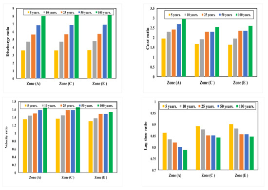 Finally, comparisons between the studied parameters (outfall discharge, cost, velocity and lag time) for the different zones, A, C and E, are presented in Figure 12, Figure 13 and Figure 14 for the most common runoff coefficients, 0.50, 0.60 and 0.70, respectively. The comparisons revealed that, for all cases, the outfall discharge, velocity and total cost of the system have increased with the increasing runoff coefficient and lag time has decreased, which is important in the warning process. These results give the designer the opportunity to choose between the cost of the system and the safety of the studied areas, which mainly depend on the return periods and urbanization presented in the runoff coefficient. This can help the designer to obtain a primary estimation of the system before it is fully designed. This also can give the preliminary cost of the system.