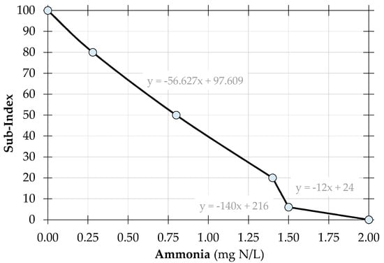 - Sub-index rating curves and functions: Sub-indices (si) and sub-index rating curves; considering that water quality parameters are monitored in different scientific units; sub-indices are applied to convert the different units of measure into a single common non-dimensional scale [44]. This is a common practice and the conventional method involves sub-index rating curves which are later transformed into mathematical functions commonly known as sub-indices. For practical purposes, fixed key points of the rating curves were graphically established with reference to the permissible concentration limits. Straight-line graphs were used to converge the plotted points and produce a series of linear graphs, which were further converted into linear sub-index functions. Target Water Quality Ranges (TWQRs) as prescribed by DWAF [45,46,47] were consulted in the process. Due to the nature of the article, only the sub-index rating curve and mathematical function for NH3 are presented herein as Figure 2 and Equation (2).where: SIa is the sub-index for ammonia (NH3) and xa is the observed water quality reading of the respective water quality parameter.