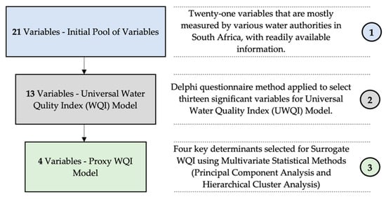- Variables: thirteen predefined explanatory water quality parameters (NH3, Ca, Cl, Chl-a, EC, F, CaCO3, Mg, Mn, NO3, pH, SO4 and Turb), which are listed based on expert opinion [27]. Rand Corporation’s Delphi Technique was applied to incorporate expert opinion from a panel of thirty water specialists from government parastatals, private sector and academia. Delphi Questionnaires were circulated to the participants and were asked to consider twenty-one water quality parameters for their possible inclusion in the UWQI. The panelists were instructed to designate each variable as: “Include” and “Exclude” and further assign a relative significance rating against each variable elected as “Include.” The rating scale ranged from one to five, whereby “scale 1” denoted the uppermost significance and “scale 5” represented a comparatively low significance. In addition to the prescribed twenty-one parameters, the experts were allowed to add at most five more variables if desired. A total of twenty-one questionnaires were returned out of the thirty questionnaires circulated. The Rand Corporation’s Delphi Technique is described in detail by Horton [36], Brown, et al. [37] and Linstone and Turoff [38,39], and the method is applied in several studies which include Kumar and Alappat [40], Nagels, et al. [41] and Almeida, et al. [42].