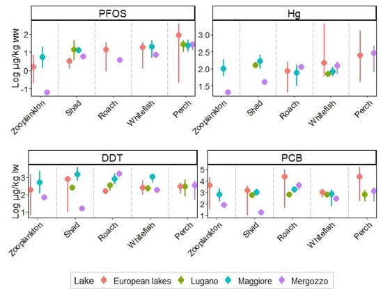 Based on this, the evaluation of the status of Lake Mergozzo has been carried out by means of the investigation of the presence of some widespread accumulable and persistent contaminants in biota samples. Detailed data regarding chemicals concentrations of Hg, DDTs, PCBs and PFASs in biota collected from this lake are reported in Tables S2–S5. DDTs and PCBs concentrations were normalized to the lipid content (lw), while PFASs and Hg are reported as wet weight (ww) concentrations, as requested also by EU regulations, and a brief summary is given below.