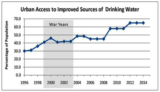 While the informal water market continues to respond to the demand for basic services that the State can still not satisfy, the Government sees these vendors as the enemy of modern development, branding them profiteers or “water traffickers”. However, the authors argue that the Government should not criminalize the informal market but view the operators as allies [7,8] (interviews on DW’s research on urban water markets and equitable basic service fees in Angolan newspapers and radio programs), at least until the capacity of public utilities has been extended to serve all urban citizens. Understanding the informal water supply market was important to see if and how it could be adjusted to function in conjunction with the official supply system, helping to fill the gaps until all urban users were reached. Figure 1 shows the trajectory of the growth of formal water supply systems in urban areas of Angola during the years of war and peace. Improved water systems include household connections but also community standposts and public protected wells that are within 100 meters of households. The graph in Figure 1 ([9] p. 140) demonstrates that about one third on all city dwellers, representing a large majority of musseque dwellers, still depend on the informal market for their water.