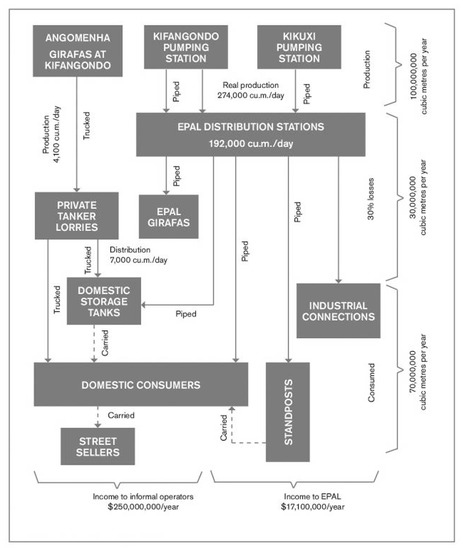 Throughout Luanda and other urban centers in Angola, the informal water markets still operate with the supply chains that were described in this paper. Although the water market continues to be considered parallel, it is progressively crossing over and connecting at strategic points with the formal supply system demonstrated in Figure 2. Despite patronage by the State, Angola’s private sector was slow in creating and offering sustainable business models. Innovation in the markets for water supply has largely come from the informal sector. This is evidenced by the group of water-truck operators who founded ANGOMENHA to fill a gap in the water system and reach communities beyond the piped water system. Their business model is sustainable because, along the supply chain, the small profits are distributed and they pay their taxes, essentially entering the formal market. The delivery of water by lorry, however, is very expensive and wasteful in energy and labor, and these high costs are passed on to consumers. Even MoGeCA’s peri-urban beneficiaries are burdened with paying close to the real cost of water production, while the economic elites, lucky enough to have running water from the piped network in their homes, have used their political weight to actively resist and postpone enforcing government plans to enforce full cost recovery for municipal services [4].