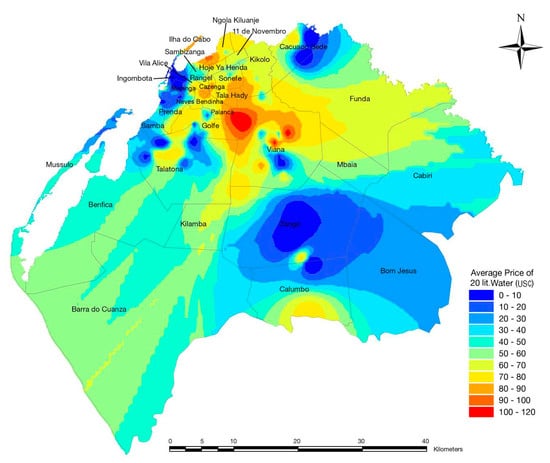 New water systems serving individual households were built to serve the high-income greenfield commercial areas being built in the city’s southern suburb, Luanda Sul. Such new systems also bypass low-income communities with high density on the route. Water infrastructure in the newly developed subdivisions significantly increases the value of land plots for the private benefit of real-estate developers. However, little revenue is earned by EPAL, which sells water at the official subsidized price to a relatively small number of customers residing in these low density housing areas [5]. The official subsidized price for water in 2017 was USD$0.25 [17], compared to the informal market price averaging about USD$10.00 per cubic meter, forty times more. The map in Figure 3 shows the variation of water prices across the city of Luanda, demonstrating the high cost of water in the informal musseques.