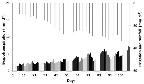 Daily evapotranspiration, rainfall, and irrigation during the experiments.