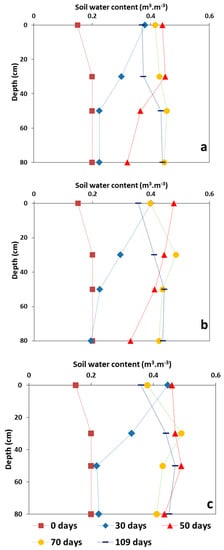 Measured soil water content profiles for treatments with (a) fresh, (b) saline (3.5 dS·m−1), and (c) saline (7 dS·m−1) water at 0, 30 50, 70, and 109 days.
