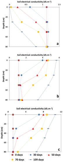 Measured soil salts profiles for treatments with (a) fresh, (b) saline (3.5 dS·m−1), and (c) saline (7 dS·m−1) water at 0, 30 50, 70, and 109 days. Different scales are used on the horizontal axis.