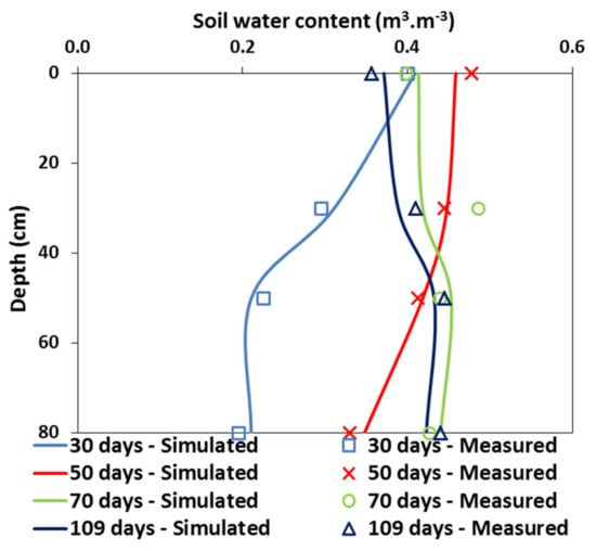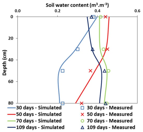 Graphically, the simulated values of soil water contents are close to those measured at each sampling depth and each sampling date in both validation experiments. Slight deviations from the measured values were observed in the layers between 20 and 40 cm on days 70 and 109. These graphical results are confirmed by the RMSE, CD, EF, and CRM values calculated for each profile (Table 4) with statistical indicators having less than optimal values on days 70 and 109, confirming model deviations from measured values.