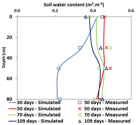 Measured and simulated soil water content profiles for the treatment with the irrigation water quality of 0 dS·m−1 at 30, 50, 70, and 109 days.