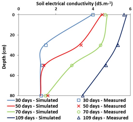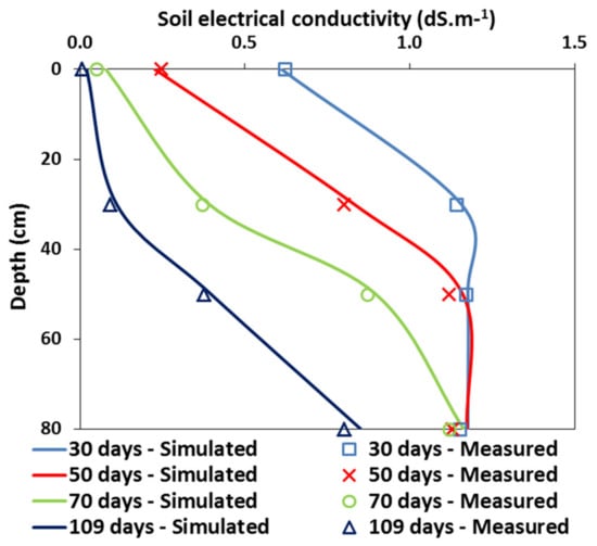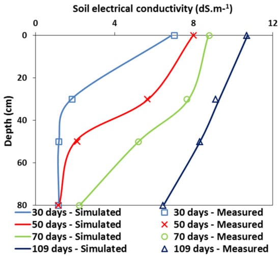 Measured and simulated soil salts profiles for the treatment with the irrigation water quality of 0 dS·m−1 at 30, 50, 70, and 109 days.