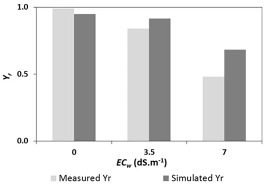 The relative crop yield (Yr) cannot be estimated directly by the Hydrus-1D model. According to [], the relative crop yield (Yr) can be estimated as the ratio between the actual and potential (or maximum) root water uptake (transpiration), and these two values are available in the model. Figure 10 displays measured and simulated relative crop yields as a function of the irrigation water quality (ECw). According to [], Yr = Ya/Ymax, where Ya is the measured yield, and Ymax is the maximum yield. In our case, Ymax corresponds to the weight obtained in the experiment with freshwater irrigation and is equal to 2.53 kg/plant.