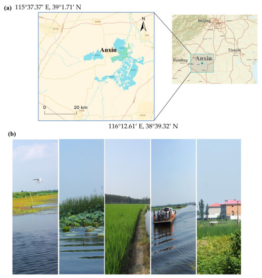 The study area, the extent of 2145 km2 covering Baiyangdian wetland and land around the wetland, is located in the county of Anxin in Hebei province, China (Figure 1). Baiyangdian wetland is the largest natural lake wetland that remains in the North China Plain. This wetland, surrounded by farmlands and residents, is strongly disturbed by human activities such as water transportation, cropping, building houses, fish farming, and leisure parks, etc. Baiyangdian wetlands mainly consist of the water body, aquatic vegetation, few crop fields, and tiny spots of houses (Figure 1b). The aquatic vegetation, including floating and emergent plants, seasonally grows over the water surface from June to September, while the water body becomes visible during the non-growing season of this aquatic vegetation [19]. The water body that the satellite observes is the water surface uncovered by aquatic vegetation, which is called open water hereafter. Water is the most important ecological factor in Baiyangdian wetland, which is recharged by the rivers from precipitation and artificial recharge water [20]. The water depth changes from dozens of centimeters to five meters [21]. The amount of water flowing into wetland from the rivers has been declining due to the large increase in human water over-usage, including agricultural irrigation, industrial and household water consumption. To maintain the aquatic environment of wetland, the works of artificial water have been implementing each year since the 1990s through drawing the water from the river and current South-to-North Water Transfer Project to wetland [22,23].