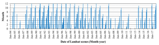 We collected available L1T products data of Landsat time-series from 1984 to 2017 released by the United States Geological Survey (USGS) over the study area (WRS-2 path/row 123/33) (url: https://espa.cr.usgs.gov/). The data are at 30 m spatial resolution from observations of TM, ETM+ and OLI sensors onboard Landsat 4, 5, 7 and 8, respectively. The 190 fully cloud-free time-series scenes during 34 years from 1984 to 2017 were collected in the study area. Generally, the four seasons of each year have available data (Figure 2) excluding the 5 years in 1985, 1986, 2007, 2010, 2012, which have less than two scenes available due to the influence of cloudy coverage and data quality. The digital number of Landsat L1T data was converted to the reflectance at the top of the atmosphere using calibrating coefficients provided in the product metadata (MTL) file and the introduced algorithms by the Landsat missions (url: https://landsat.usgs.gov/calibration-parameter-files-search).