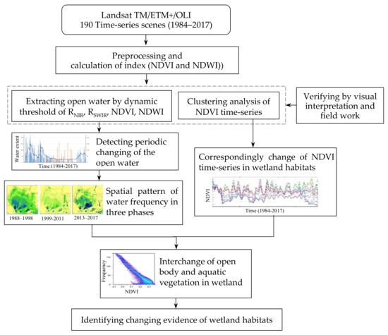 Flow chat of tracking changing evidences of water in wetland using the satellite observing data.